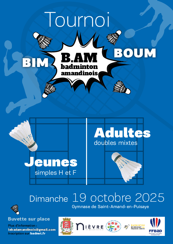Le Badminton Amandinois (le B.AM58) a le plaisir de vous inviter à son premier tournoi Jeune et Adulte intitulé "TOURNOI BIM B.AM BOUM" le Dimanche 19 octobre 2025.
