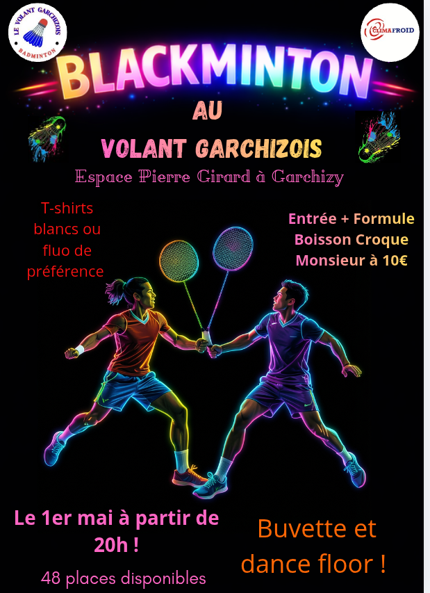 Le 1er Blackminton du Volant Garchizois est déplacé au Vendredi 1er mai 2026 pour des raisons d organisation.
